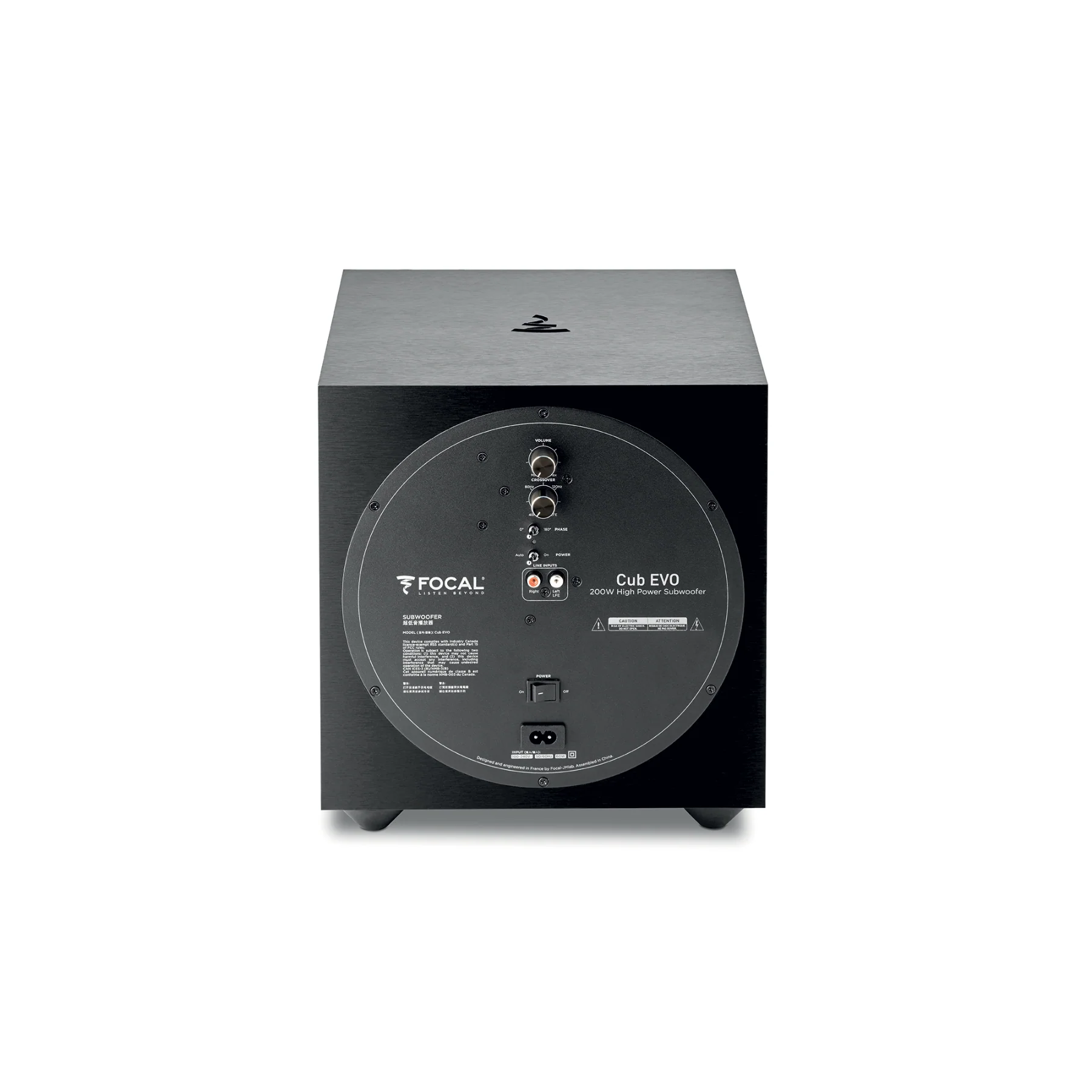 Para satisfacer las exigencias del entorno de escucha, Cub Evo ofrece todas las características de los subwoofers Focal: filtro de cruce, inversión de fase, función autopower ON/OFF, entrada LFE... Su amplificador de 200 W (Clase D) ofrece frecuencias potentes y dinámicas dignas de equipos más grandes.